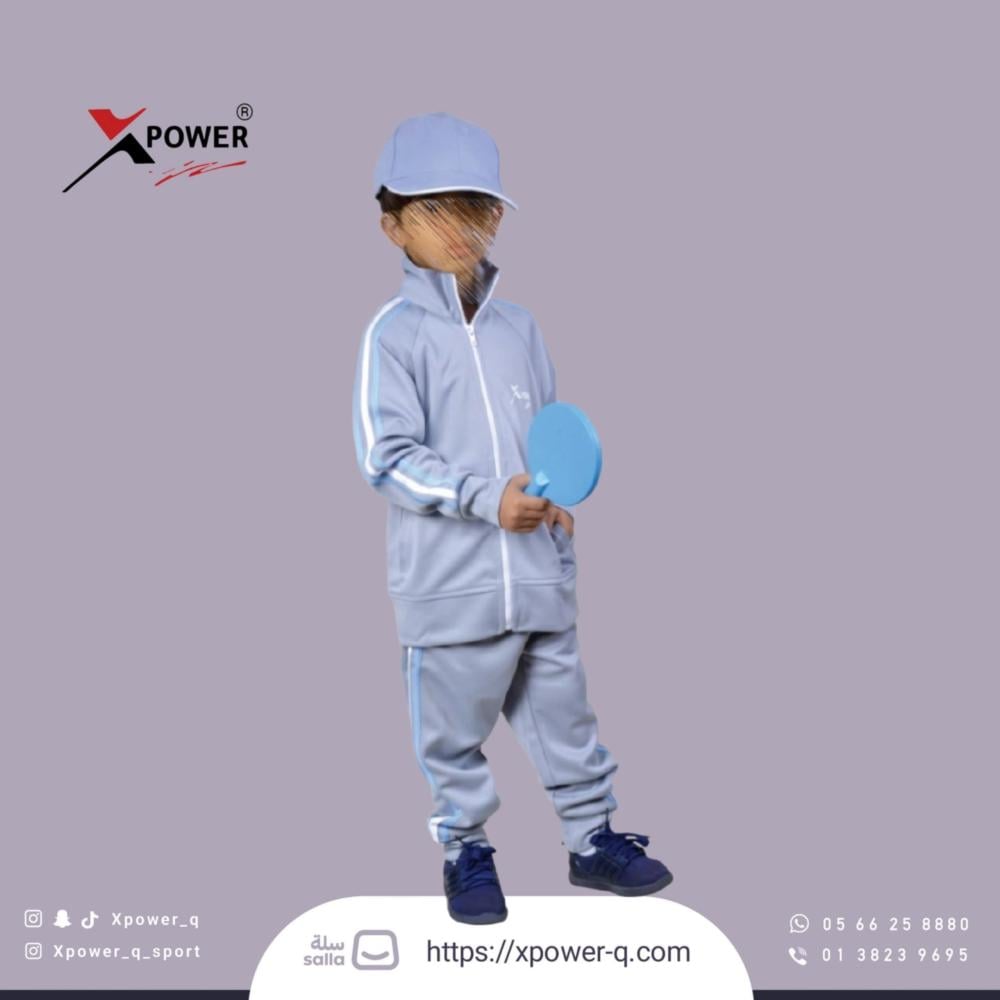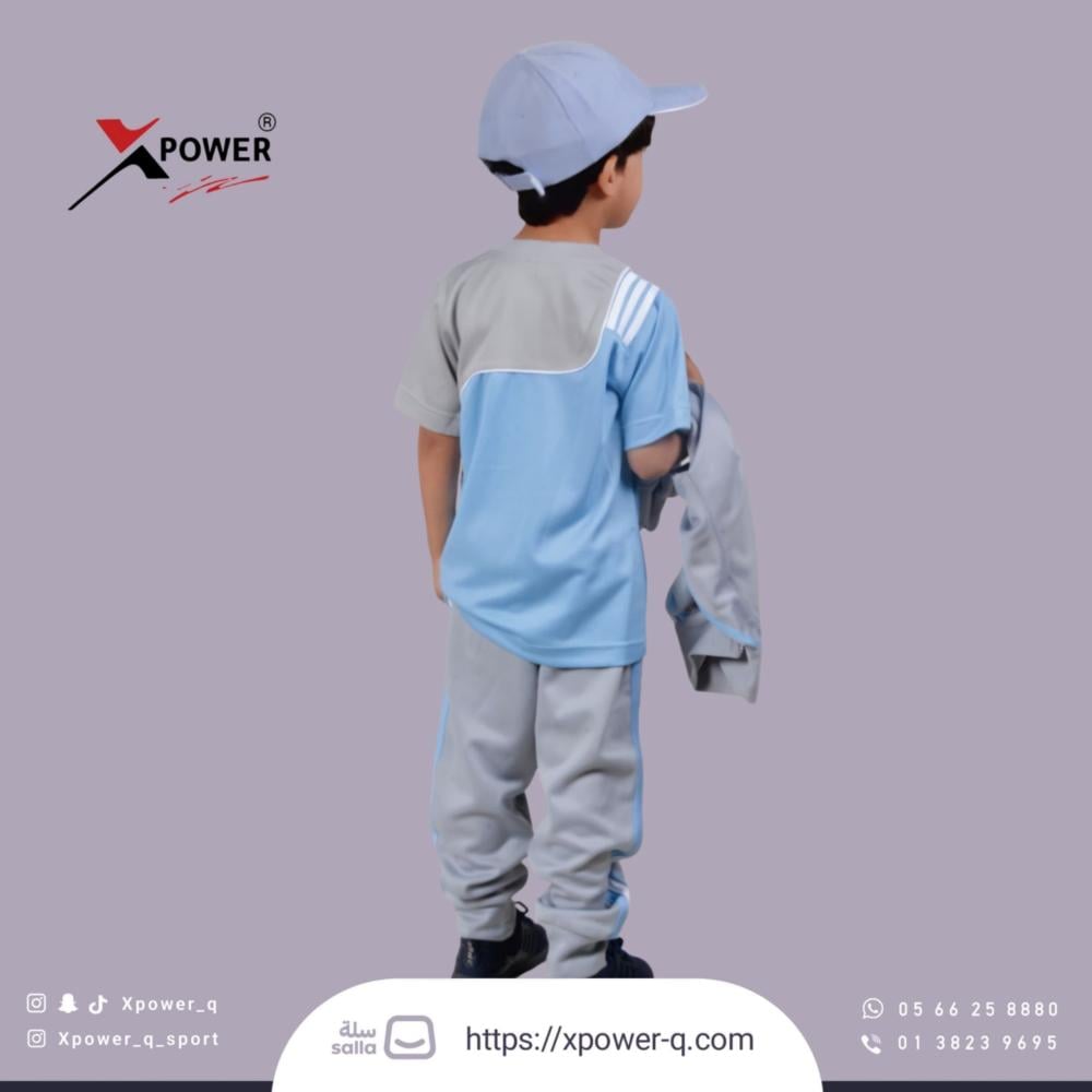 طقم رياضي مكون من ثلاث قطع (سروال/تيشيرت/جاكيت) باللون الرصاصي والأزرق.